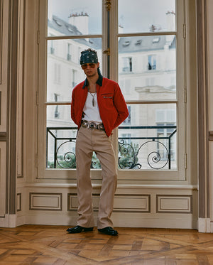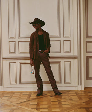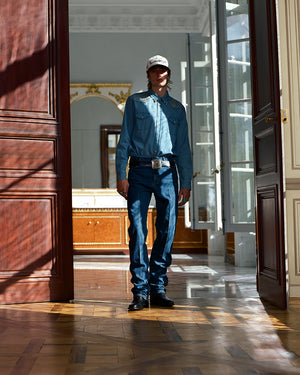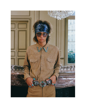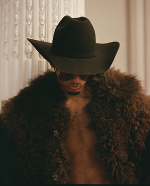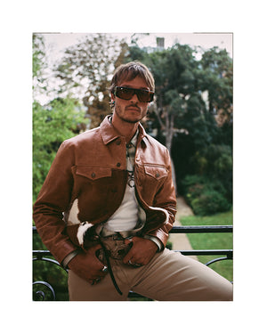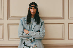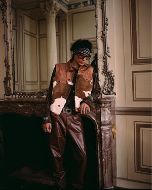 Photographed on select models from the show, the styling highlights pieces available in Drop Two: hair-on leather statements, studded denim shirts, velvet jackets, and western-inspired leather fringe. Guided by craftsmanship and artistic expression, the collection reflects Post’s rock-star sensibility—leaning into a bolder, more elevated side of the brand first revealed on the Paris runway.
